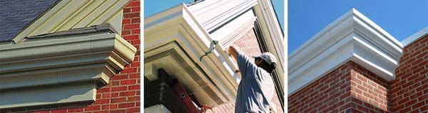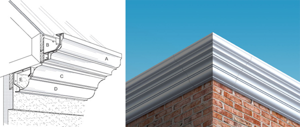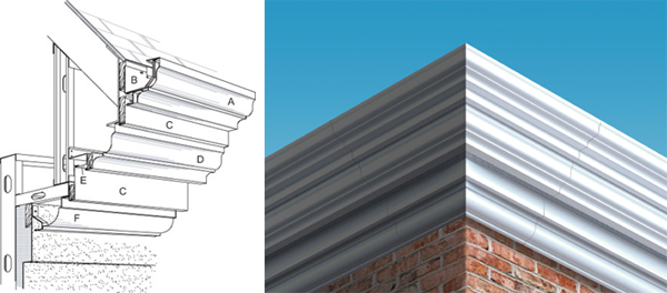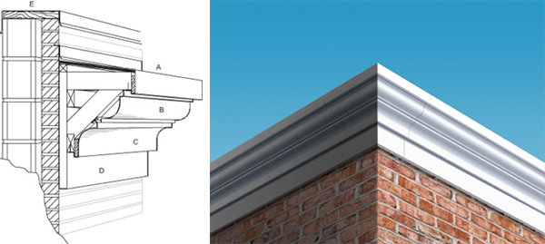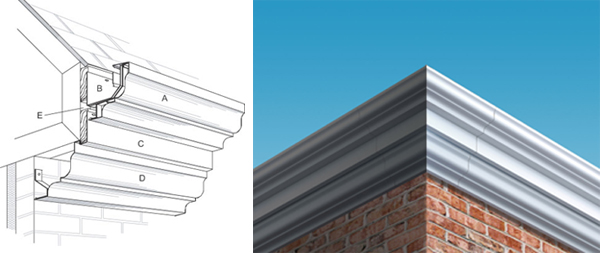 With 1-1/2" & 3" radius profiles, along with fascia covers, box trims & soffit trims, you can virtually design any type of cornice imaginable. From simple moldings, to complex multitiered cornices, our sculptured profiles will do the job. Features All aluminum cornice shapes are precision crafted in our plant using special built radius dies on a CNC Press – they are not roll formed which means they are uniform from end to end, piece to piece. Joint treatment consist of a concealed splice with a 3/8" expansion reveal. All cornice shapes and trims inter change with one another and are designed to be watertight, sealants are rarely necessary. Cornice Design #1