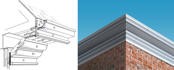 B. Liner and bracket assembly. C. Box Trim with 3/8" expansion reveal joints. Installer should align joints for all cornice trims. Installer should plan his cornice runs so that no section of the exposed components are shorter than 60". Joints that are equally spaced provides the most attractive assembly. Note that Box Trims can be ordered for any type dimensional lumber. D. Soffit Panels (12" widths), v-groove, interlocking design. Panels can be solid, vented, or mixed to your preference. Front edge of panels are held in place with return edge of J-Cover and the interlock edge is nailed or screwed to the support framing. E. 3" Convex Mould Type 4 (modified) with 3/8" expansion reveal joints. Installer should align joints for all cornice trims. Installer should plan his cornice runs so that no section of the exposed components are shorter than 60". Joints that are equally spaced provides the most attractive assembly. E-1. 3" Convex Mould Type 3 with 3/8" expansion reveal joints. Cornice Design #8
