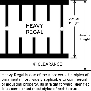 HEAVY REGAL Heavy Regal is one of the most versatile styles of ornamental iron, widely applicable to commercial or industrial property. Its straight-forward, dignified lines complement most styles of architecture without sacrificing security. Its vertical pickets are solidly welded between square, horizontal rails and every panel is expertly hand-crafted under the most demanding standards of quality control. It has been carefully designed for easy installation and maximum life expectancy. Fencing: HEAVY REGAL STYLE BY BFC Rails: 1-1/2" x 1-1/2" 14 GA. tube steel.