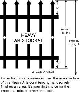 FENCE PANELS REGAL • ARISTOCRAT • GUARDIAN STANDARD SIZES: REGAL & ARISTOCRAT:Heights: 5’, 6’, 7’, and 8’. Lengths: 94", 118"GUARDIAN: Heights: 7’, 8’, 9’, and 10’. Lengths: 94" RAILS: 1-1/2" x 1-1/2" 14 GA. steel tube PICKETS: 3/4" x 3/4" 16 GA. steel tube at 4-3/4" O.C. or 6" O.C. POSTS: 2" x 2" 14 or 11 GA. steel tube with pressed steel cap. Space posts at 8’ O.C. or 10’ O.C.