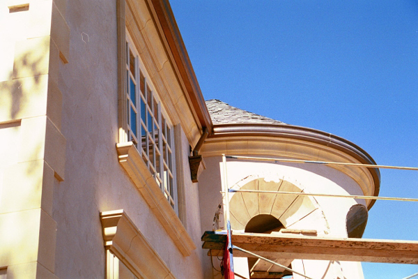 Malibu gutter, both straight, and stretch formed, increase the depth, and style, of the roof line detail on this magnificent residence, under construction, in Blackhawk, California.