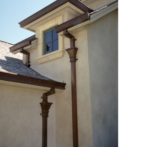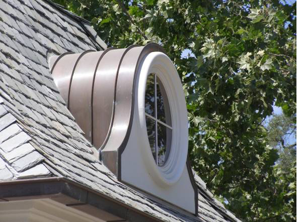 This is one of ten copper roof dormers, adorning the pool house of a Southern California residence. The box gutter has a traditional bead and custom copper bar straps.