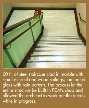 From Concept to fit and finishThe PCM team will provide engineering, shop drawings, submittals and finished samples, measure exact specifications onsite, fabricate the project, deliver and install it down to the last bolt and polish. Clients recognize PCM’s ability to work in tandem with architects and contractors, as well as coordinate with various sub-contractors. This is unique in our industry. Glass Supplied, Coordinated and Installed AAG, Arch Deco, Nathan Art Glass, NGI Glass, Oldcastle Glass, Pulp Studio, Rudy Art Glass.