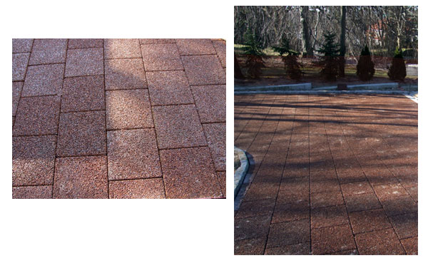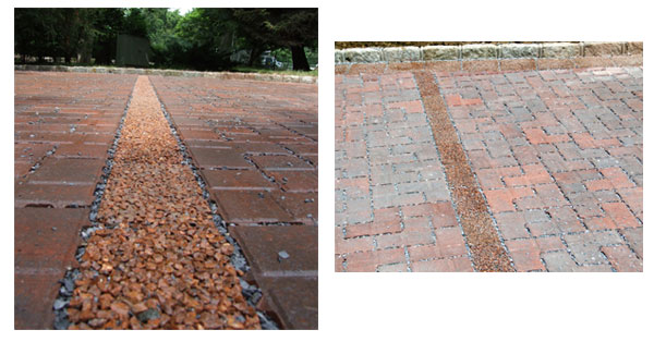 PERMEABLE PAVERS: Permapave™ Permeable Pavers provide the hard surfaces required for urban living. Permapave™ surfaces are safe and non-slip for pedestrians, bicycles, and cars yet allow stormwater to pass freely through the substrate to return to the water source. Our pavers typically display compressive strengths between 4,000 and 8,000 lbs/square inch depending on the type and size of the stone used. Pavers are inert when cured and unaffected by salt or UV. Permapave™ porous segmental pavers are ideally suited as a practical long term alternative to porous concrete. Permapave products are truly an environmentally integrated solution because they perform the same function as traditional paving products, yet do not impose on the natural environment. Permapave products allow rainfall to drain through the body of the paver and be absorbed by the earth and into subterranean aquifers. Permapave™ Pavers can be laid in strips on top of bio-retention pits, in low lying sections of any large area of urban paving such as parking lots and industrial warehouse sites, where large amounts of polluted stormwater is likely to collect. Permapave™ Pavers can be laid around trees and other plantings to increase water absorption to plant roots. FEATURES OF PERMAPAVE™ PERMEABLE PAVERS: