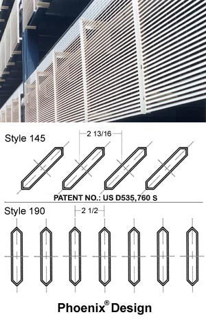 NEW! Phoenix® Design Style 103 4" x 1/2" Aluminum Extrusions on 2-13/16" Centers – 45 deg. blade Style 104 4" x 1/2" Aluminum Extrusions on 2-1/2" Centers – 90 deg. blade Both designs are polyester powder coated, giving long life with a touch of elegance to harmonize with any environment yet remain maintenance free for many years. In the interest of improving quality and design, Ametco® reserves the right to amend specifications without giving prior notice.