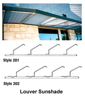 Louver Sun Shade Style 201 offers 80% direct visual screening and Style 202 offers 100% direct visual screening. These styles have a 6-foot maximum span. Perforated Sunshades The angle frame is engineered for each job based on the span. Examples: for a 6 ft. span, a 2” x 2” x ¼” angle frame is required; for a 10 ft. span, a 3” x 3” x ¼” angle frame with center tie bar is required.