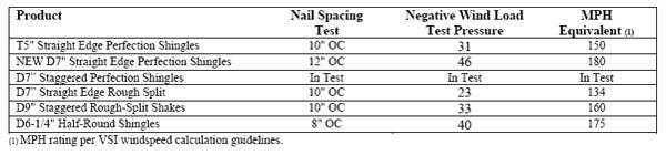 Important Fire Safety Information: When rigid polypropylene is exposed to significant heat or flame, the polypropylene will soften, sag, melt or burn, and may thereby expose material underneath. Care must be exercised when selecting underlayment materials because many underlayment materials are made from organic materials that are combustible. You should ascertain the fire properties of underlayment materials prior to installation. All materials should be installed in accordance with local, state and federal building code and fire regulations. Wind Load Testing: Cedar Impressions siding products have been tested per ASTM 5206 standard test method for wind load resistance to withstand negative wind load pressures and their mph equivalents as shown in the chart below. All products exceed industry standards for wind load performance. Check with your local building inspector for wind load requirements in your area for the type of structure you are building.