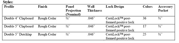 Colors: Monogram siding profiles are available in the industrys widest selection of colors. All colors are Spectrophotometer controlled and utilize exclusive PermaColor™ color science.