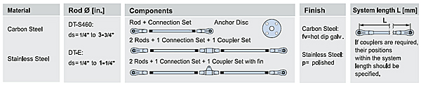 Carbon Steel System DETAN-S460 Available in nineteen diameters, the DETAN System is supplied in two carbon steel strengths: System diam. 6 mm to 12 mm (1/4 in. to 1/2 in.) yield strength = 51.5 ksi ( 355 MPa ). System diam. 16 mm to 95 mm (5/8 in. to 3-3/4 in.) yield strength = 66.7 ksi (460 MPa). By using high grade steels the DETAN System is able to provide superior performance and economy, while saving material and weight. Stainless Steel System DETAN-EDETAN Tension Rod Systems in stainless steel are typically used in applications where a high resistance to corrosion is necessary, or where a polished finish is preferred. Stainless steel tension rods are available up to six meters (19’-8”) long in 9 diameters, ranging from 6 mm to 30 mm (1/4 in. to 1 -1/4 in.). As with the carbon steel system, couplers and anchor discs may be used to extend the system when long spans are required. System Selections