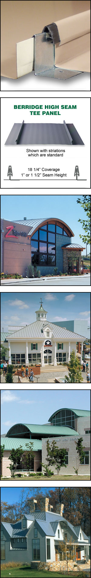 Berridge's High Seam Tee-Panel provides concealed fasteners and uses a patented vinyl weatherseal as an integral part of the Snap-On Seam to protect from water siphoning and flooding. It may be curved on-site using Berridge's SS-1421 Portable Roll Former with standard striations. Berridge High Seam Tee-Panel is available in 24-gauge and 22-gauge in all of Berridge's prefinished colors as well as Satin Finish and Acrylic Coated Galvalume® .