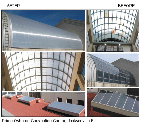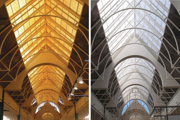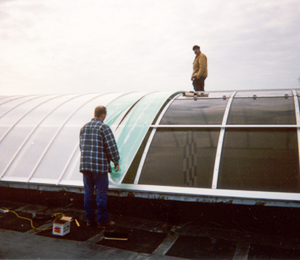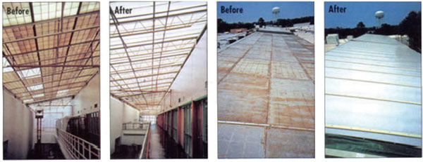 A retrofit Pentaglas® glaze skylight measuring 20' x 113' was used by Meharry Medical College to replace a 20 year old skylight which was leaking and dark. The bronze Pentaglas® provides significantly more light than the previous dark bronze acrylic panels, and the watertight design prevents any future leaks. The simple retrofit installation did not interrupt the important medical research functions of the building, and the original frame of the skylight was retained with a few modifications, resulting in tremendous savings. CPI Glass Retrofit Systems Extend the Life of Deteriorated Glass SkylightsCPI Retrofit Skylight systems offer the following advantages: