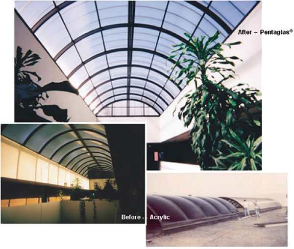 VISIT OUR WEBSITE FOR PRODUCT DETAILS ABOUT THE FOLLOWING TRANSLUCENT RETROFIT SYSTEMS CPI Overglaze Retrofit Systems Enveloping Leaking Skylights or Vertical Glazing Pentaglas® or Quadwall® systems can be designed to envelop leaking acrylic or glass systems. The source of the leakage is eliminated by floating a new skin over the existing structure and glazing. The new light-transmitting skin creates a complete, permanent waterproof membrane, ensuring a leak-proof seal. CPI Fiberglass Retrofit Systems Replacement of Failed Fiberglass Sandwich Panels