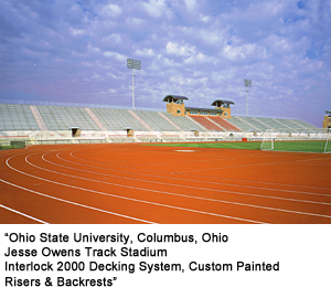 The 7,168-seat Jesse wens Track Stadium on the Ohio State University campus is an excellent example of the versatility of our Horizontal Beam stadium. The University faced a myriad of issues and problems including space constraints and historical preservation of the existing track. The completed stadium addressed these issues and helped Ohio State honor the name of Jesse Owens with this premier facility for track and soccer. The stadium features our Interlock 2000 decking system and custom color painted risers and backrests.