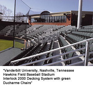 Vanderbilt University's 1,604-seat Hawkins Field is an example of the precision required of a mitered stadium. The mitered design surrounds and enhances the ball diamond. Every seat offers an excellent view of the field. The versatility of the mitered design is based on our Horizontal Beam substructure that offers the opportunity to customize with brick or a variety of other materials. Underneath this stadium are concessionaires for the fans.