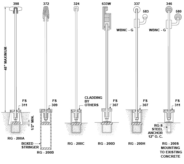 These loads satisfy UBC, BOCA, and OSHA codes. For shorter rail lengths or higher rails, send preliminary sketches to Blumcraft's engineering staff for review. Physical Test Report of tempered glass railing prepared by an independent testing laboratory shall be furnished to architect showing compliance with the above requirements. Aluminum Mounting Base Assembly shall be a two piece system with one member permanently installed to the building structure ready to receive the other member that has been bonded to the glass. All shall be rigidly anchored to floor or stairs in a positive manner including sufficient reinforcement and anchoring as required. Aluminum Handrails and Mounting Base shall be U.S. Alloy 6063 Satin Finish, Clear Anodized, Duranodic Medium Bronze, Dark Bronze, or Black. Wood Handrail — Wood shall be bonded to aluminum sub-structure forming a complete handrail unit. Specify wood type and aluminum finish. Replacement of Glass Panels — Glass panels shall be made removable for replacement without chipping out the embedded glass at the building site. Installation — Shall be rigid and secure, installed by mechanics experienced in erection of architectural metal and glass. All screws and fittings shall be drawn up tightly. Rails shall be set plumb and aligned. Railing sub-contractor who makes the installation shall be fully responsible for the rigidity, the workmanship, and the finished appearance of the installation and shall comply with Blumcraft instruction sheets. Shop Drawings — The railing sub-contractor shall forward shop drawings to Blumcraft for manufacturer's recommendations prior to submission of Blumcraft’s drawings for architect's approval. Note to Architect — As the rigidity of the railglass without posts is dependent on the method of mounting the aluminum base to the building sub-structure, it is suggested that the architect's preliminary drawings be reviewed by Blumcraft's technical staff.