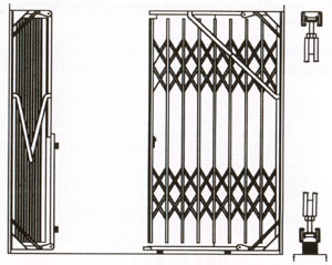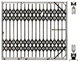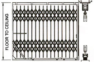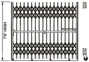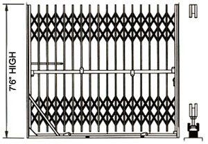 Three sets of lattices for gate over 9' -6" high. Recommended maximum width 16' -0". Equipped with stationary top track with rollers and bottom folding track with rubber floor pads and 4-wheel ball bearing carriages for easy operation. Gate can be fixed or mounted to Type "A" cabinet.