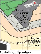 On homes where eaves and rake are visible from the ground, a drip edge sets off the area where siding and shingles meet. Install drip edge along the eaves after applying adhesive membrane (if installed) but before applying Typar RoofWrap 30. Install along the rakes after applying Typar RoofWrap 30 and under flashings. Shingles typically overhang the drip edge by 1 inch at the eaves and rake.