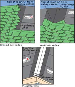 On some asphalt roofs, shingles are woven across valleys, eliminating the need for flashing. Line valleys with a vertical length of Typar RoofWrap 30 down the center before applying horizontal sections of underlayment. Overlap sections by 20 inches to ensure water will run over the top of the liner. Cut horizontal sections at an angle as the center of the valley is reached and overlap by at least 8 inches. Do not drive nails within 6-inches of the center line.