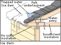An ice dam forms when heat from a trapped attic air slowly melts snow on the roof. As the water reaches the roof's edge, it freezes and creates a dam of ice. As the meltwater increases, so does the dam. In time, melted water is forced under the shingles and through the sheathing and can create enough force to lift shingles. However, proper ventilation and insulation will prevent the uneven temperatures that cause ice dams.