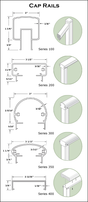 - Series 350 Caps: 3-1/2" wide elliptical cap rail. The sleek, stylish design offers another option for those who prefer a less angular cap rail appearance. Requires an Applied Grab Rail when used on stairs.