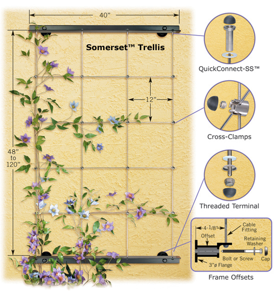 The Somerset™ trellis is designed for mounting on vertical surfaces. It’s an all inclusive trellis kit that’s available in seven standard height packages (from 4 ft to 10 ft; 1 ft increments) with cables that can be field trimmed to your exact height requirements. It consists of powder coated aluminum angle brackets top and bottom that screw or bolt to the wall face. Four 1/8" diameter stainless steel cable assemblies are strung vertically between the brackets and secured with special, easy to use, adjustable QuickConnect-SS™ and Threaded Terminal cable fittings. The 1/8" diameter stainless steel rods are then attached to the cables horizontally using special Cross-Clamps with locking set screws.