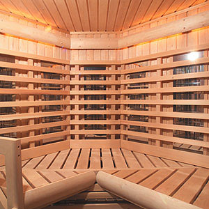 The 6x6 free-standing room includes a Helo 4.5 kW digital sauna heater and nine infrared heaters incorporated into the wall panels. Both systems--sauna and infrared--operate independently of each other with digital control panels mounted near the door.