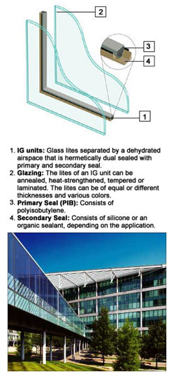 The standard 1" commercial IG unit consists of two lites of 1/4" glass and a nominal 1/2" air space. Custom IG unit designs can be fabricated with glass thicknesses ranging from 1/8" to 3/4" and with airspace thicknesses ranging from 3/16" to 7/8" having standard spacer colors of clear, bronze and black anodized, and mill finish aluminum. Maximum sizes for IG units are determined by a number of considerations, including thickness, weight, aspect ratio, application and load requirements. Applications Characteristics By combining Low-E coatings, standard and high performance tinted glasses, reflective coatings, silk-screened patterns, laminated glass products and more, a wide variety of insulating glass configurations are available to satisfy a wide range of performance and aesthetic requirements. IG units can be fabricated to meet state energy and safety codes, sound control and seismic requirements and impact, bullet, hurricane and blast resistance requirements. IG units can be designed to reduce heat loss and solar heat gain entering the building, with a minimal reduction of visible light transmittance. SunGlass™ |