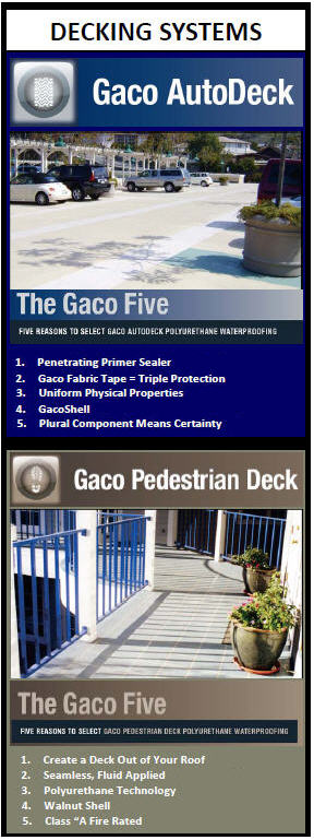 Perhaps your next project is rehabbing a multi-level parking garage, or perhaps it's a new deck on a single-family home. In either case, Gaco Western has a decking system to meet your needs. Gaco auto and pedestrian deck systems are characterized by two key ingredients; tough elastomeric coatings, and GacoShell texture granules that won't scuff out. GacoFlex coatings are color-stable, and are available in a variety of attractive colors. Gaco coatings are also elastomeric, meaning they are able to stretch as the substrate warms and cools through the day and through the seasons. Characterized by high physical properties, GacoFlex coatings are tough enough to withstand years of abuse by sun and weather. GacoShell texture granules won't scuff out of the coating, eliminating the premature wear often caused by loose granule grinding into the coating surface. The GacoShell texture wears evenly with the coating, meaning the integrity of the waterproofing system is never compromised by granule popping out of the coating. Gaco has developed decking systems to meet specific project requirements. From quick-set auto deck applications, to intricate pedestrian deck designs, Gaco Western can help you successfully tackle your next decking challenge. Gaco Western LLC |