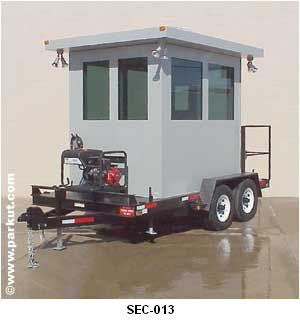 SEC-013 Mounting a portable generator to the tongue of the trailer supplies the unit with a self sufficient power source or use the fishtail power cord when site service is available. Booth comes complete with work counter, lighting, outlets, and HVAC system.
