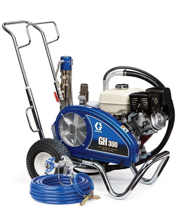 Graco’s GH 300 is the largest of the GH family of sprayers. Built with a rugged and durable Honda 270 cc (9.0 hp) engine, it’s ideal for spraying heaviest materials such as elastomerics, block fillers and dry fall.