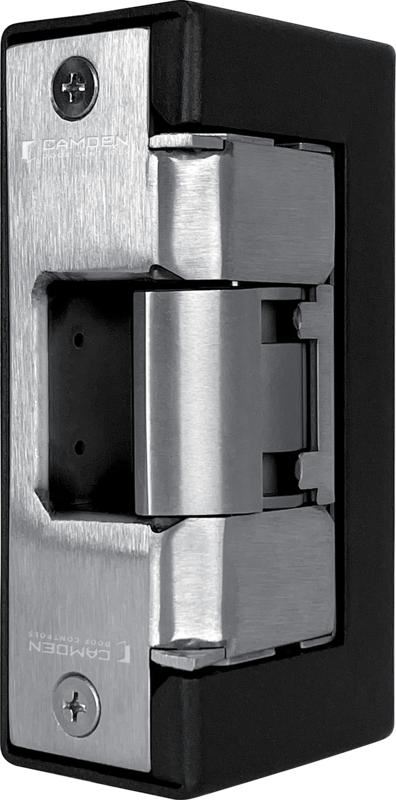 Camden CX-ED1959 Series outdoor-rated strikes feature heavy-duty stainless steel construction with an integrated ANSI square faceplate and Grade 1 performance. Compatible with cylindrical locksets and centreline mortise locksets without deadbolts. The CX-ED1959 Series models include a heavy gauge painted steel mounting box at no additional charge.