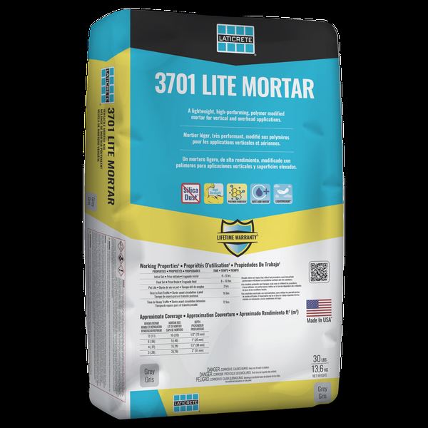 3701 Lite Mortar does not need a latex admixture. You will only need to add water to produce thick bed mortar or a vertical repair mortar/screed. It contains no respirable crystalline silica levels that exceed the OSHA action level*. 3701 Lite Mortar weighs half the amount of a conventional thick bed mortar and retains the same coverage.