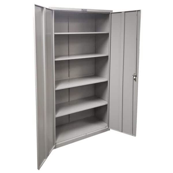 Durable Steel ConstructionThe metal office cabinet features durable steel construction. Squared front corners provide a modern look. The full height double doors open wide to allow you full access to all areas of the cabinet. Each of the steel doors include three hinges. These hinges along with a pan type reinforcement help maintain the door alignment. Lyon’s “Quiet Door” feature also reduces noise when you are opening and closing the doors of the cabinet. The 2-3/4″ high base provides extra toe room below the storage cabinet when the doors are open. This also helps raise items on the bottom shelf so you don’t have to reach down as far to grab them.
