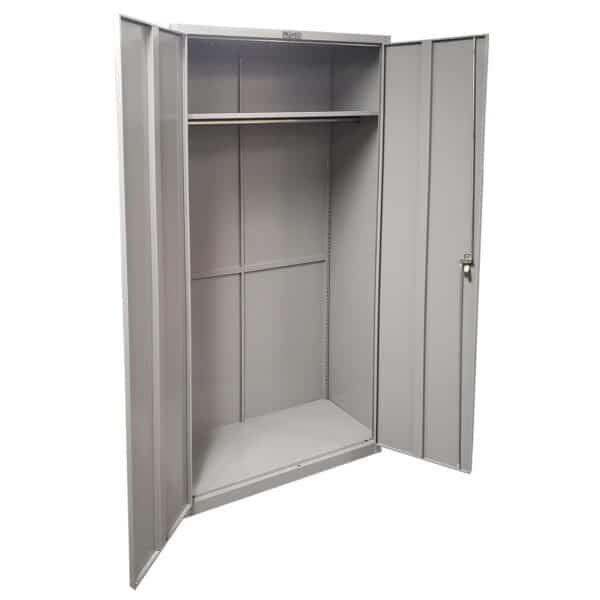 Durable Steel ConstructionThe metal wardrobe cabinet features durable steel construction. Squared front corners provide a modern look. The full height double doors open wide to allow you full access to all areas of the cabinet. Each of the steel doors include three hinges. These hinges along with a pan type reinforcement help maintain the door alignment. Lyon’s “Quiet Door” feature also reduces noise when you are opening and closing the doors of the cabinet. The 2-3/4″ high base provides extra toe room below the storage cabinet when the doors are open. This also helps raise items on the bottom shelf so you don’t have to reach down as far to grab them.