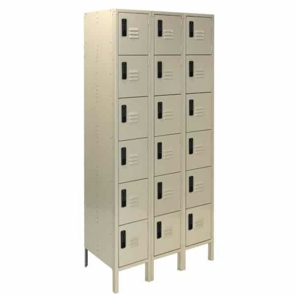 Lyon has long been America’s leading manufacturer of quality Metal Lockers. You can find our 18 door metal locker with keyless electronic locks in offices and workplaces all over the USA. They also are great for use as gym lockers with digital locks. You can use this 18 door locker either as a standalone unit or combine it with more lockers to create a full locker system. We proudly manufacture these employee lockers with digital locks in the USA. These lockers come with a durable powder coat paint available in our standard Putty finish.