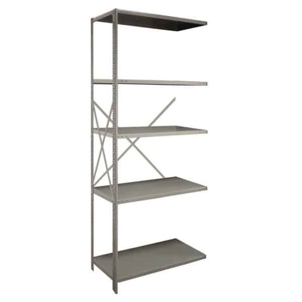 Adjustable Steel ShelvesThe 2000 series open steel shelving beaded post add-on includes 5 heavy-duty shelves Our 20-gauge heavy-duty are ideal for storing heavier items such as tool boxes and large parts. The patented box design of our Industrial Metal Shelves provides added strength in both the front and rear of the shelf. The lapped and welded corners provide extra strength and durability.
