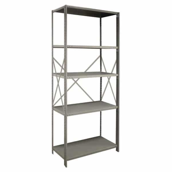 Instantly create more vertical storage space with Lyon’s 2000 series open steel shelving beaded post starter unit. This 3 foot shelving unit is ideal for storing items where high visibility is a concern. The open sides and back allow light to penetrate a storage area as well as allow for free air flow around stored materials. Our industrial open shelving allows you to see from either side. This 5 shelf metal shelving unit offers great storage space for light parts and aerosols as well as heavier items like tools or safety supplies. Our tall open shelving unit is ideal for use as either a warehouse or commercial metal shelving unit. We offer our Industrial Steel Shelving with a durable powder coat finish available in Dove Gray. The powder coat paint finish will help protect your steel shelving from everyday use.
