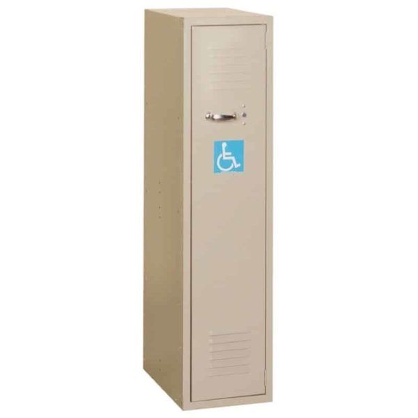 Lyon has long been America’s leading manufacturer of quality steel ADA accessible lockers. You can find our 5420 ADA single tier metal locker in schools and locker rooms all over the USA. Use this 1 door locker alone or combine it with more lockers to create a full locker system. We proudly manufacture this locker in the USA. We offer these lockers with a durable powder coat finish available in either Dove Gray or Putty.
