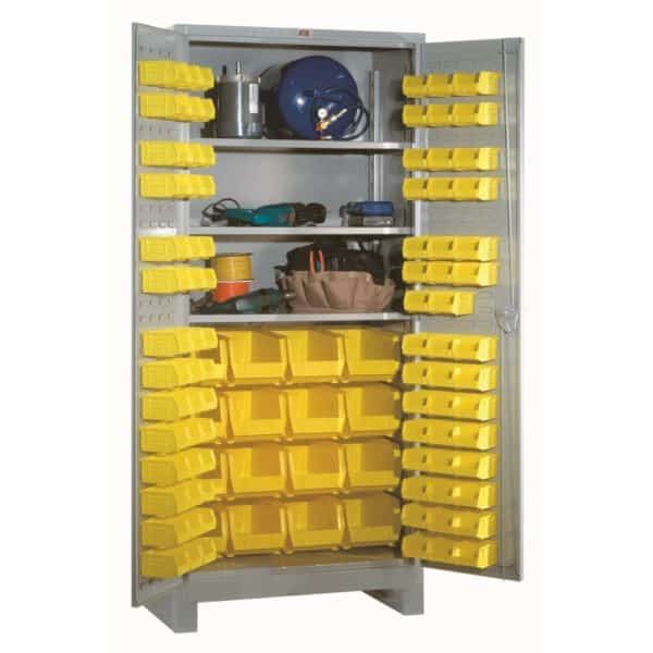 Heavy-Duty ConstructionThe all-welded 1156 industrial bin cabinet features 14-gauge steel construction. Each of the heavy-duty steel doors include three 5/16-inch diameter brass-pin hinges. These hinges allow easy opening and closing of the doors while maintaining the door alignment. Our secure 3-point locking system includes a 3/8-inch latch rod on the right door that engages both the top and bottom of the cabinet. The 3/16-inch latch plate secures the left door when the handle is in the closed position. Our sturdy aluminum handle also includes a 3/8-inch thick hasp. Easily add your own padlock to secure the doors closed on this welded 14-gauge cabinet. All of our industrial metal storage cabinets feature a durable powder coat paint finish that will stand up to harsh use.