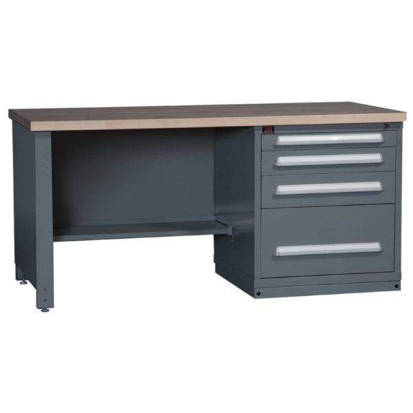 Modular Drawer CabinetThe standard wide modular cabinet of the 251WBC11 industrial workbench includes 4 drawers. These steel drawers slide open on smooth, steel glides. Each heavy-duty drawer can hold up to 400 lbs. All of the drawers fully extend to give easy access to the entire contents of the drawer. The aluminum handles include rounded end caps and will withstand years of use. Each cabinet includes both removable labels and plastic shields for the handles.