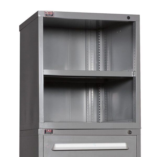 Overhead UnitLyon makes the DDN27303010500N open overhead storage cabinet out of heavy-gauge steel. The flat bottom of this unit allows you to attach the overhead directly to your cabinet below. This unit also includes one adjustable shelf. Easily adjust this shelf on 3/4-inch vertical centers. It’s easy to adjust your shelf spacing when your storage needs change! An additional base shelf sets flush in the bottom of the cabinet. The 1-inch high raised edge on the sides and back of each shelf help keep small items from slipping between the shelf and the cabinet. The shelves of this open overhead storage cabinet can also hold lots of heavy items such as tools. Easily store as much as 400 lbs on each shelf!