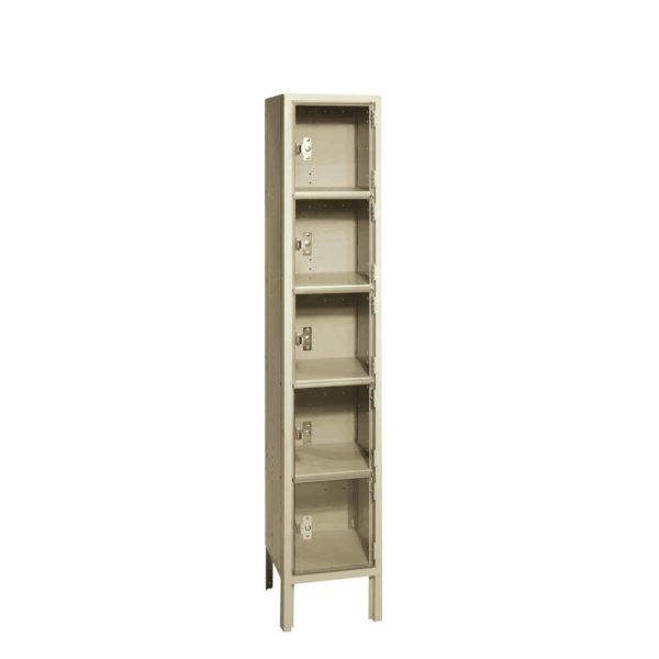 Our standard steel five tier lockers include 16-gauge, one piece doors and 24-gauge body parts. Lyon laps and welds the door frame corners to create a strong and rigid assembly. The 3-1/2-inch-wide door louvers provide ventilation for the interior of the locker. Soft rubber bumpers added at the door jamb locations provide extra cushion against door slams. A steel pull handle also includes a hasp that can be secured with a user provided padlock. The 6-inch-high legs provide additional toe room below the locker door.