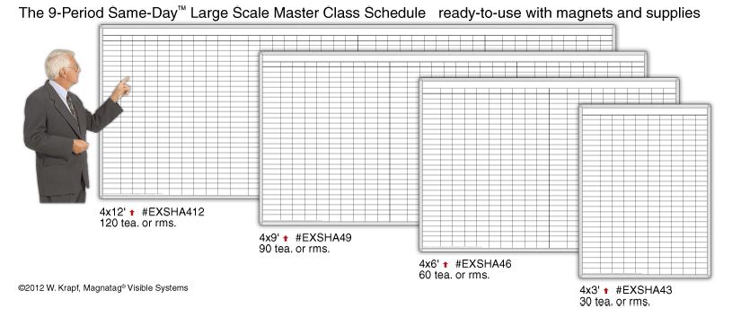 Features and benefits of this productThis magnetic Same-Day™ 9-Period Teacher Classroom Scheduling System is in a larger scale with big magnetic, 1-3/8" x 3" cardholders and card inserts for class data. It lets you post larger data that you can read from a distance and makes a strikingly handsome display you will be proud to exhibit in your office. As an option, you may order this system at the same price with plastic-laminated, write-on 1-3/8" x 3" magnets in 10 colors instead of the cardholders described above. See the price list below for this option.