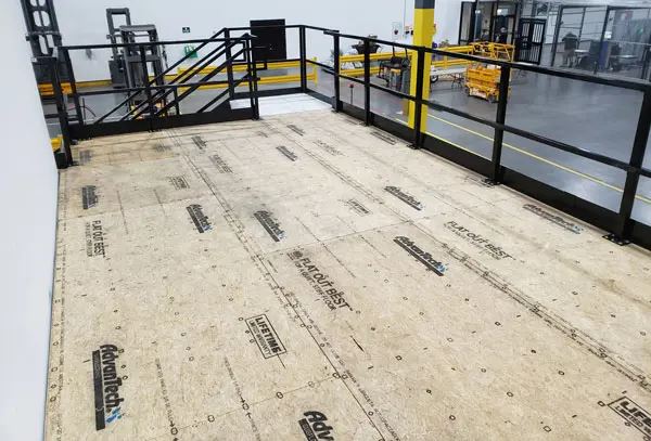 One of the most common options for decking a mezzanine is to use corrugated steel decking material covered by a layer of Advantech. Advantech is a high-quality product superior to ordinary plywood and OSB options due to its enhanced strength, stiffness, and moisture resistance. Its advanced density provides a solid and secure resistance to foot traffic and is designed to withstand weather conditions better than ordinary plywood. This decking method is considered to be our most economical selection and materials are readily available.