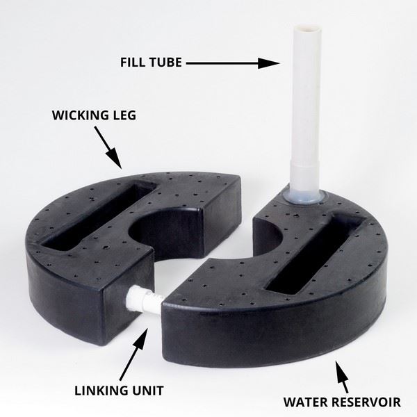 The half style is ideal for planters with a half moon or semicircular shape. Thanks to its unique design, the assembly can be pressed together to slide it in through the top of a narrow opening. Inside, it will expand again to fill up the interior of a planter, providing water up to 9 inches away on either of its sides.