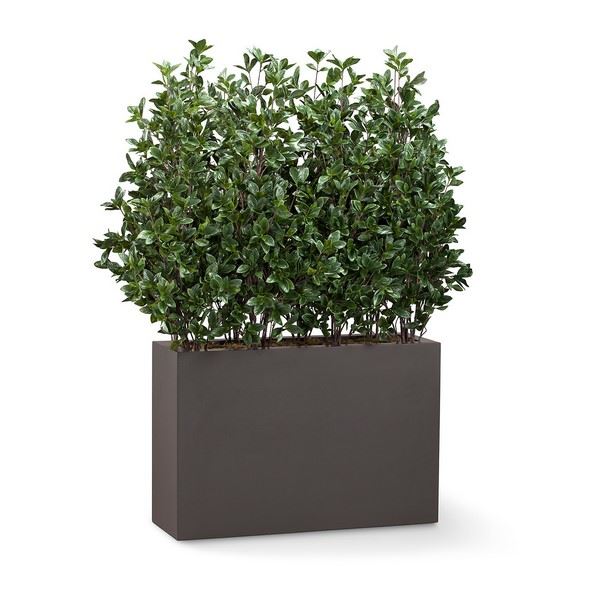 Add Outdoor Rated Cherry Laurel in Modern Planters to your next landscaping design. These low maintenance planters come pre-planted with Outdoor Rated Cherry Laurel, a UV protected "evergreen" plant with vibrant glossy leaves and realistic looking stems and trunk. We artfully arrange these with foam and a moss topper that has been inserted into our Modern Rectangle Planters painted with your choice of 9 automotive grade paints. The Cherry Laurel bushes used are 48" in height, but once mounted add approximately 36" to the overall height of the planter.