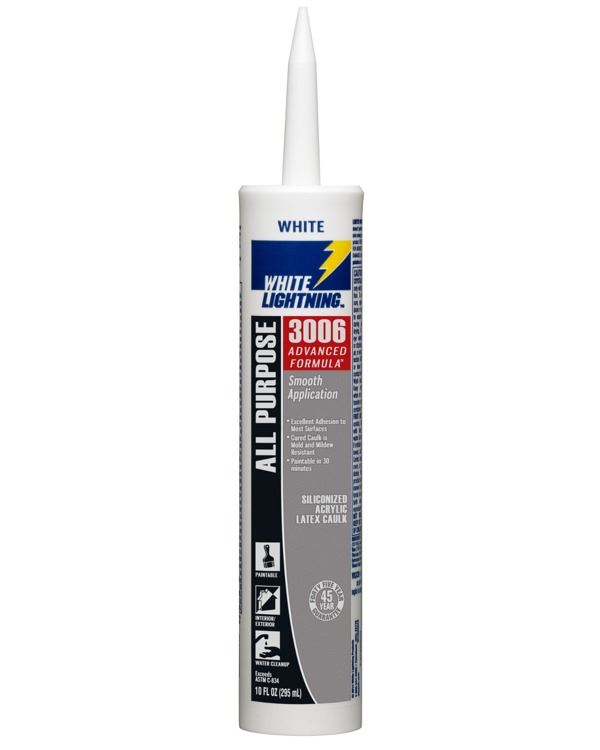 White Lightning® 3006™ Advanced Formula provides a smooth application that can be painted in 30 minutes! It is ideal for filling joints and openings around doors, windows, baseboards, trim, siding and vents. For use on: wood, drywall, metal, glass, masonry and most plastics.
