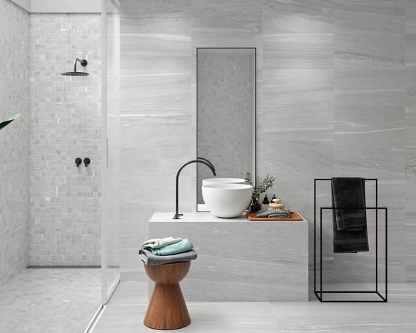 We found inspiration in the smooth veins and noble appearance of quartzite to create the North collection of stoneware tiles. It is a highly-resistant metamorphic rock with aesthetic qualities close to stone. It comes in a neutral color range and adapts to a wide variety of decorative styles, offering the versatility of porcelain offered in a 12" X 12" mosaic accent & a matching 24" X 48" large format rectified.