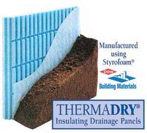 spaced vertical and horizontal channels cut into one side of the THERMADRY panels provide rapid drainage. Adhered to this channeled surface is a spunbonded