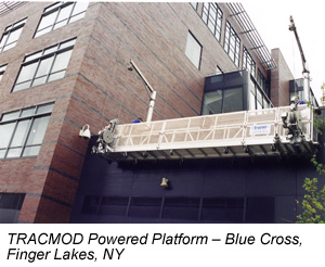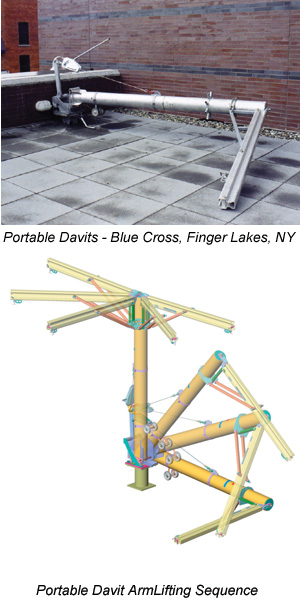 Portable Davits with Powered Platforms Powered platforms and portable davits are the most popular solution for exterior building access in North America. Tractels two-piece davits shown in the adjacent photo are designed to tilt to horizontal before detachment from the davit base. When the arms are lowered, the davit boom can be easily separated from the davit mast for movement to the next work location. The davit mast has its own transportation wheels for movement along the roof.